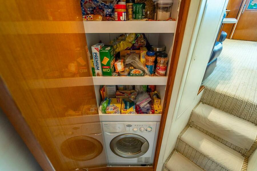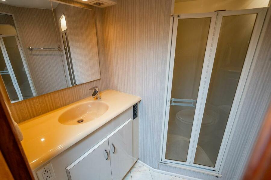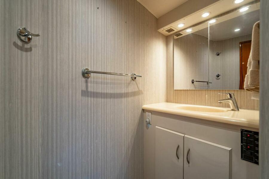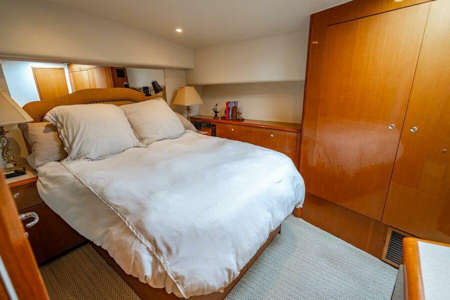 The master suite, located amidships on the port side, features a queen-size bed and a full en-suite private head. The forward cabin includes a double berth to starboard, and a raised single berth to port, while the third cabin on the starboard side offers upper and lower bunks. The flybridge is outfitted with a custom hardtop, Release helm and companion chairs, and forward companion seating. The helm console features an electronics cabinet with glass flip doors, providing secure and organized storage for navigation equipment.