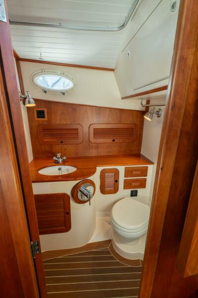 • Storage in cherry faced lockers above and outboard the vanity, a drawer with a cherry face beside the marine head, and a locker under the vanity