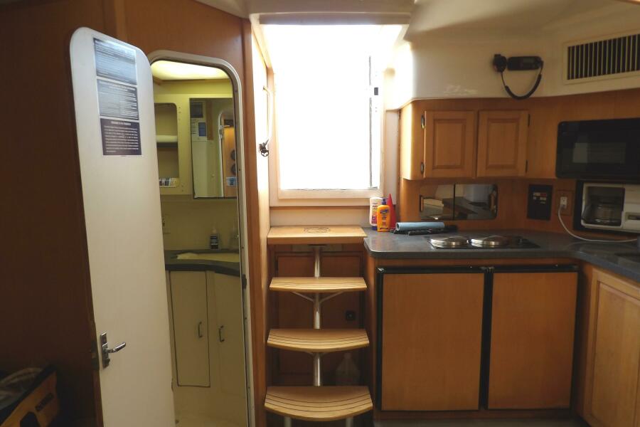 The wide beam, Carolina flare, and a sharp entry of the Luhrs 40 Open combine to deliver a smooth, dry ride. The low center of gravity increases the stability in a seaway as well as when trolling. A large center console holds all the latest in electronics and instruments while it keeps the captain in the center of the action. Visibility is enhanced by the raised custom helm seat and the fiberglass hardtop, while the full enclosure protects passengers from the elements. Rigging the bait or handling the tackle is easy with the integral bait stations which include drawers, washdowns, and a sink. An insulated icebox or the livewell will keep the bait fresh and ready to go. Standard equipment includes a full tuna tower, instruments, seating, sunshade plus air conditioning, and much, much more. Inside and to port, the raised galley is covered with Corian, trimmed in hard woods, and includes all the finest in appliances. Across the way, the head with shower is fully fiberglassed for ease of maintenance while the Corian-topped vanity provides excellent storage. The salon is complete with a color television and VCR along with a stereo CD system. There is plenty of storage throughout and even a convenient sea berth is even included. Forward, the private master stateroom has an island double berth, hanging lockers, lots of drawers and a pair of reading lights. All this and more is wrapped in warm hard woods and beautiful custom fabrics.
