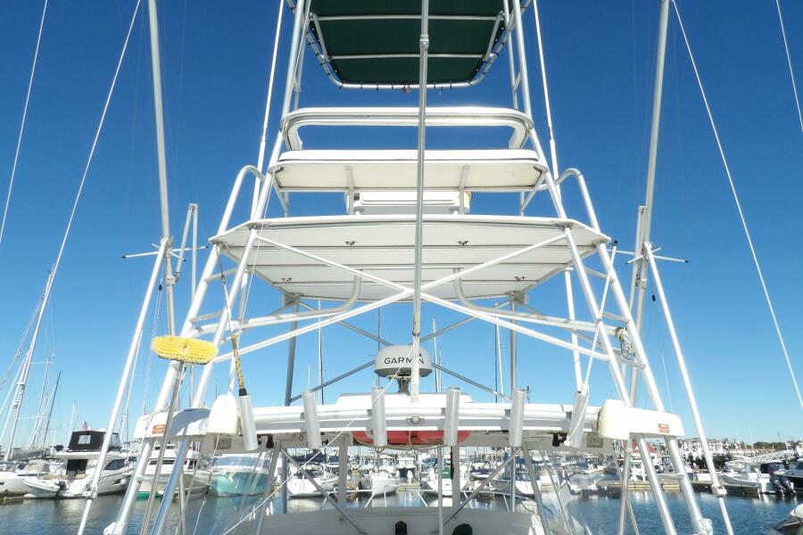 The 40 Luhrs has a great layout with a large cockpit, spacious helm with seating out of the weather, a tuna tower, and plenty of cabin space down below. "The wide beam, Carolina flare, and a sharp entry of the Luhrs 40 Open combine to deliver a smooth, dry ride. The low center of gravity increases the stability in a seaway as well as when trolling" Luhrs