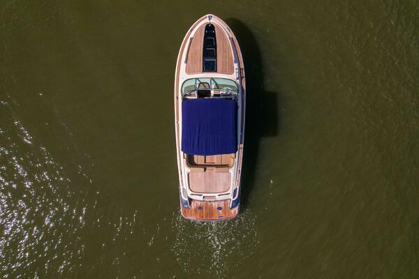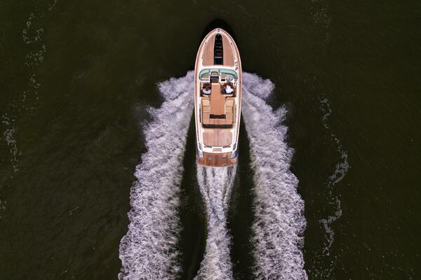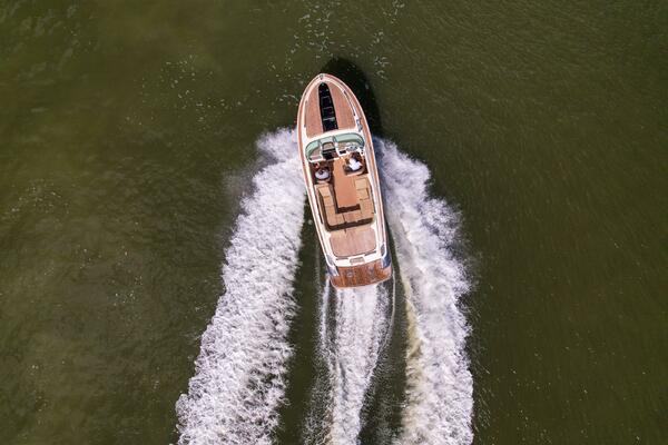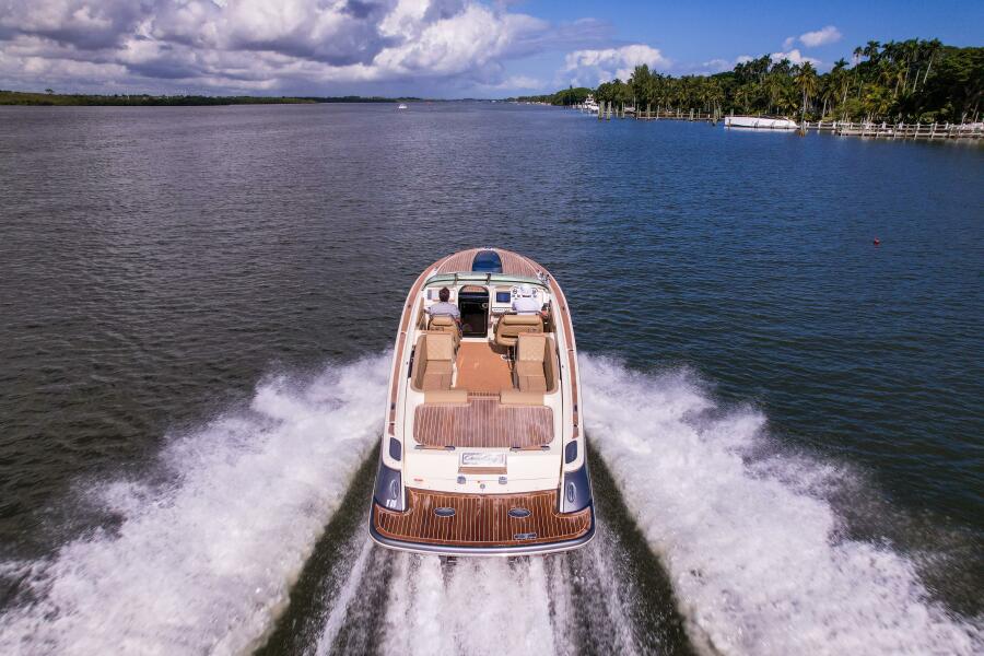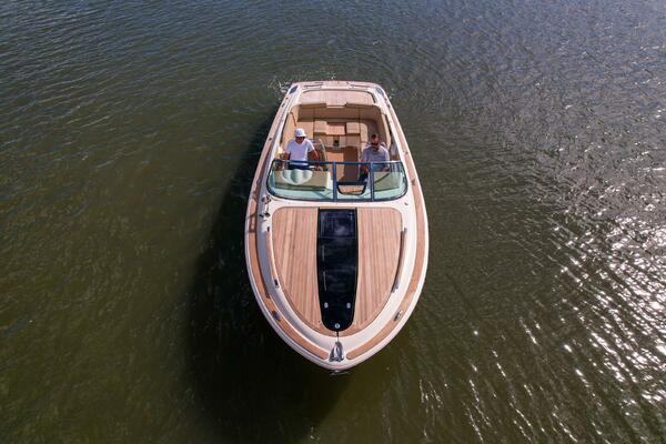 A modern classic. The Corsair 28 blends Chris-Craft’s mahogany-era lines with contemporary build quality and a ride that inspires confidence. The signature tumblehome stern, teak Heritage Package, and stainless hardware turn heads at every dock; the deep-V hull and flared bow deliver a dry, composed run when the chop picks up. It’s the rare dayboat that feels equal parts elegant cruiser and athletic runabout.