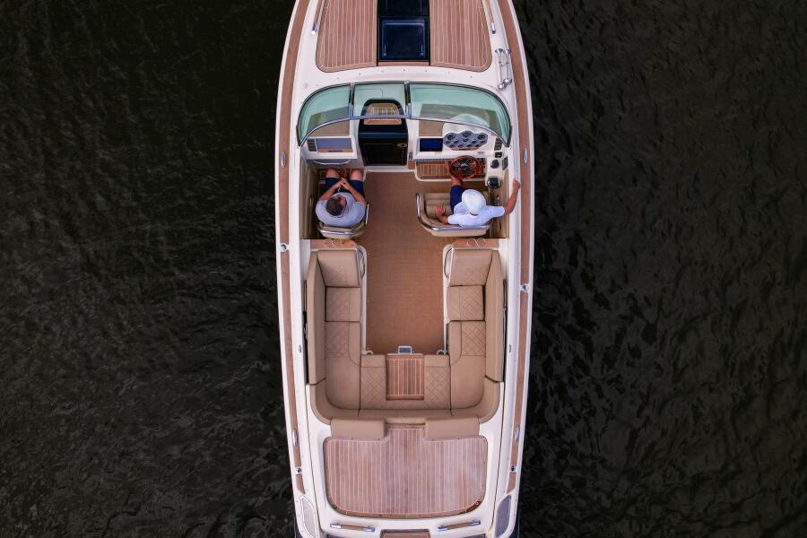 Step aboard and you’ll find an inviting, social cockpit with wraparound lounge seating, a double-wide helm seat to share the view, and a sun-pad over the engine hatch—an effortless setup for sandbar days, harbor tours, or twilight cruises. Fit and finish are unmistakably Chris-Craft: hand-finished teak, diamond-stitched upholstery, and robust hardware throughout. A compact cuddy forward with marine head and berth/storage adds real utility for quick changes, kids’ naps, or stowing gear.